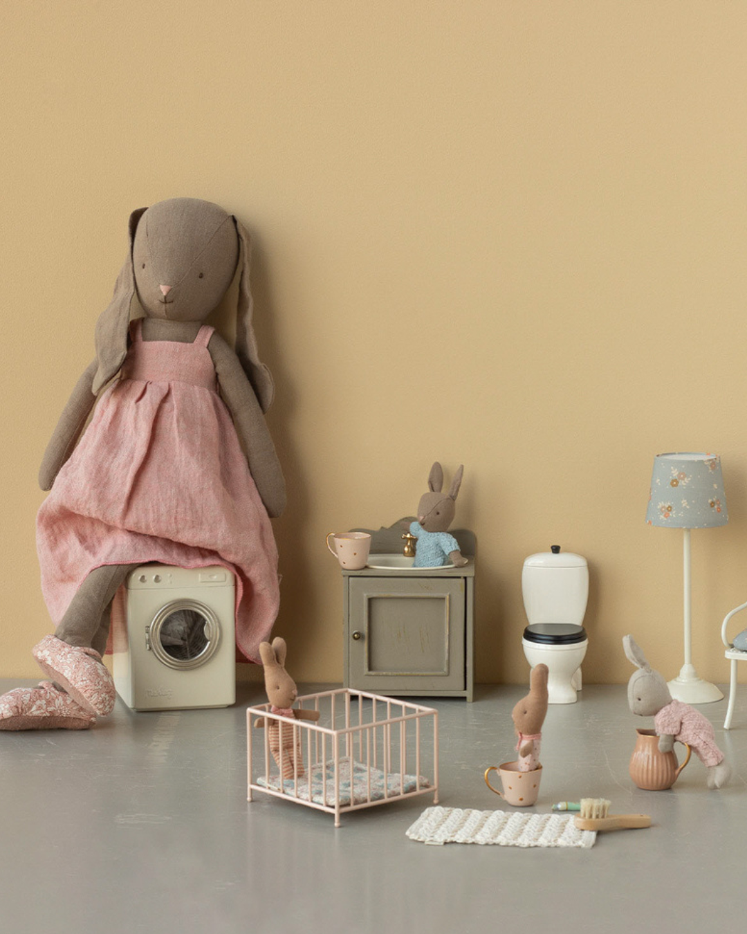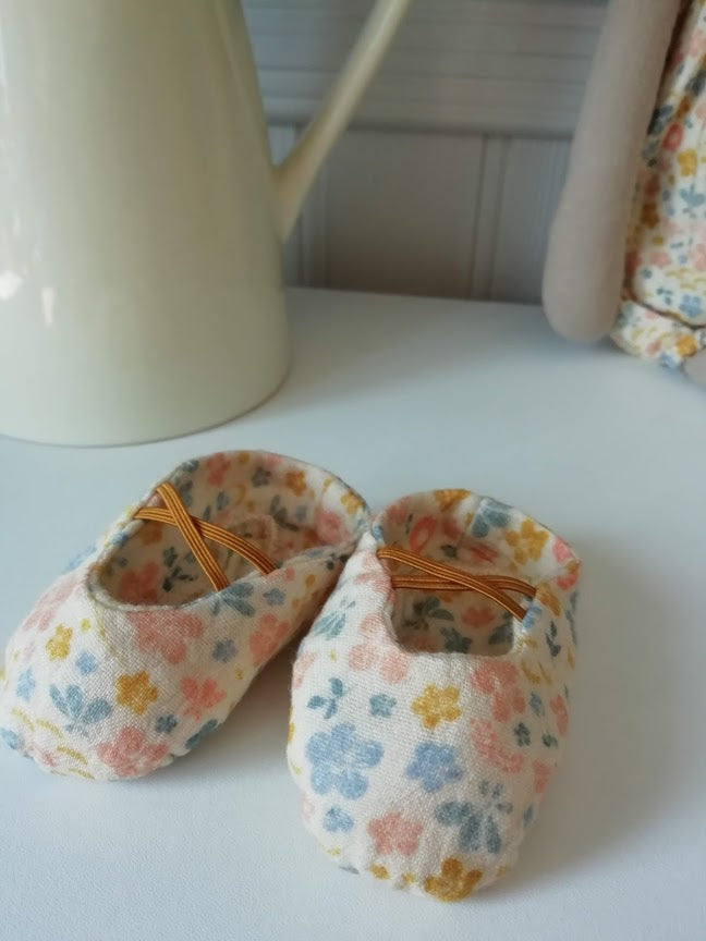 A classic bunny made of soft natural fabrics that gives a lovely hand feel and look. She is dressed up in a lovely dress, pretty knitters and wear soft shoes. Check out our clothes collection to expand the bunny's wardrobe.