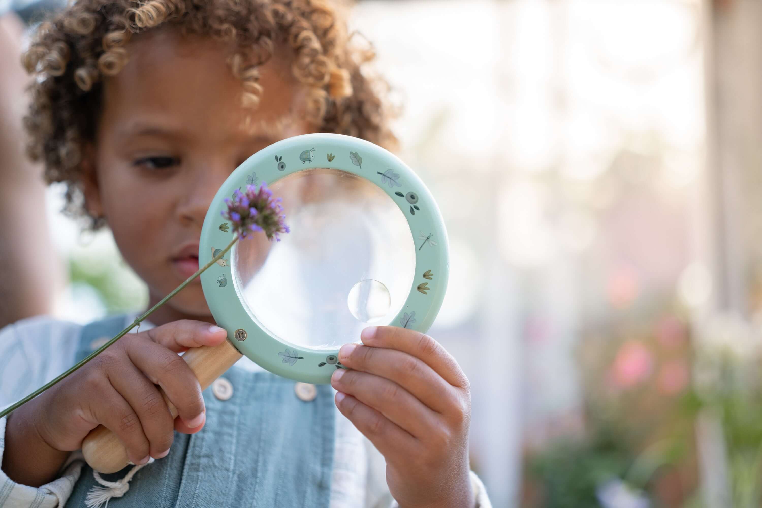 The sturdy wooden frame and handle provide a comfortable grip, while the beautiful illustrations from the Forest Friends theme give it a playful look. The magnifying glass features an integrated extra small lens for an even more detailed view. With a handy cord for hanging, it's always within reach for curious explorers.