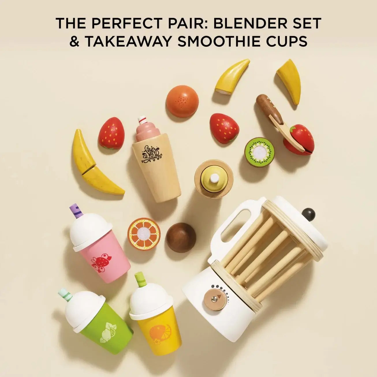 Whizz up some delicious smoothies in style with this fun, interactive set - the ideal accessory to any wooden toy kitchen. Featuring a retro style blender with a detachable jug, 6 sliceable fruits, a play knife and 2 wooden tumblers with removable toppings.  Chop, cut & count your way to a healthy lifestyle.