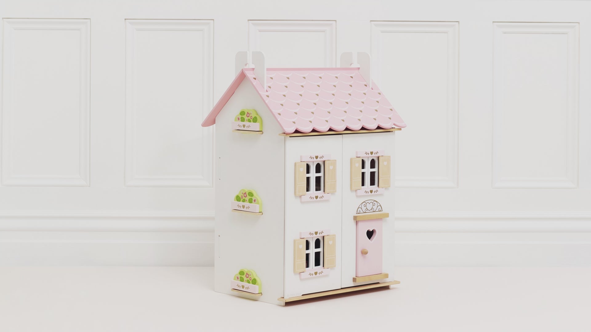 Crafted from sustainable FSC® - certified wood, this durable, high quality toy features a scalloped roof, opening and closing doors and shutters for realistic play, plus a clever lift off roof that reveals access to a sweet attic bedroom. Inside, the floors are furnished in a lovely natural wood look to complement the lovely wallpaper designs in each room.