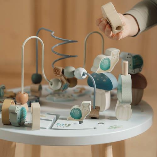 Bring the beads along the spiral from one side of the enchanted forest to the other side. Or build a tower and fill the forest with trees of joy. Complete the puzzle, turn the wheels and help the lovely animals cross the Forest Friends woodlands. This wooden multi-activity table challenges your little one in many ways.