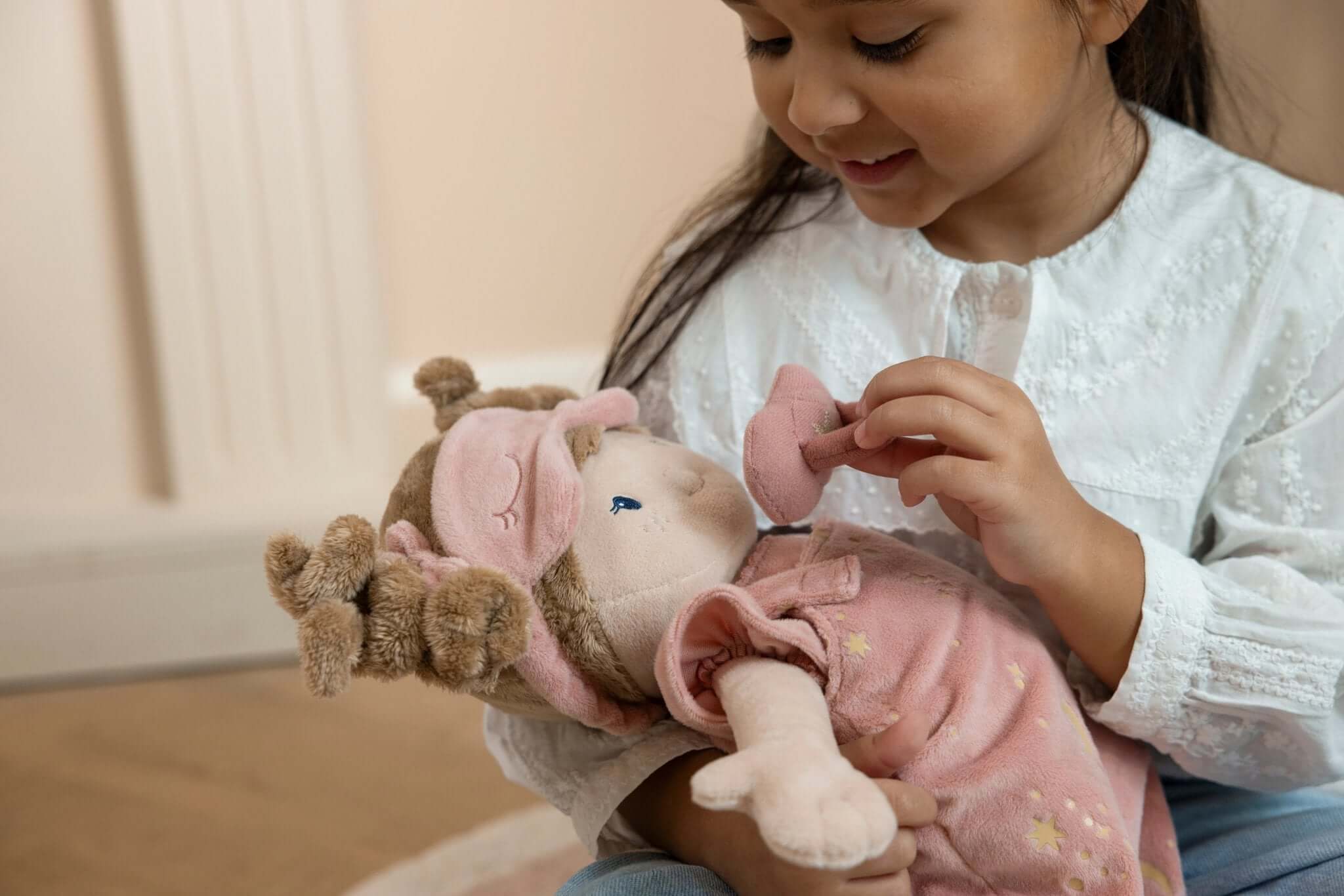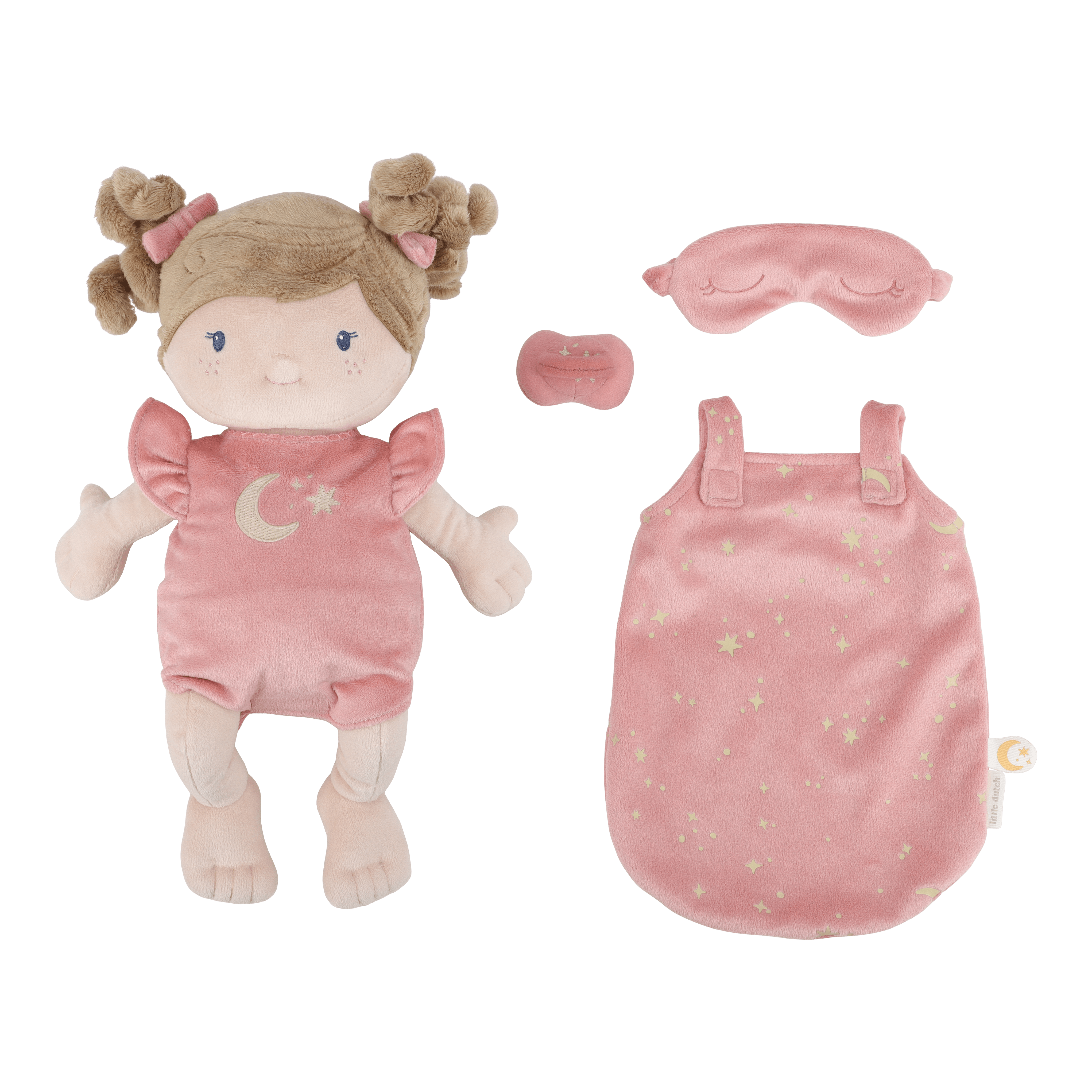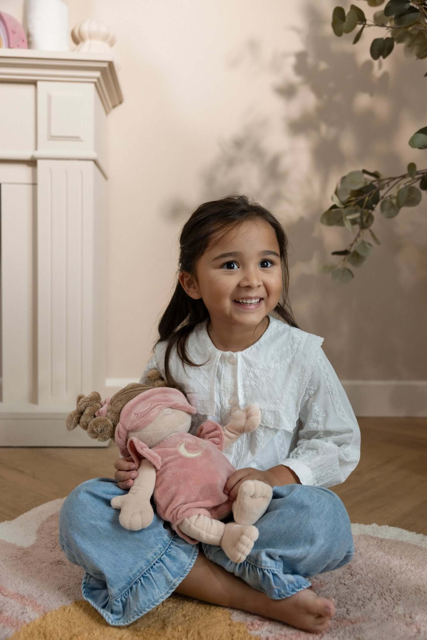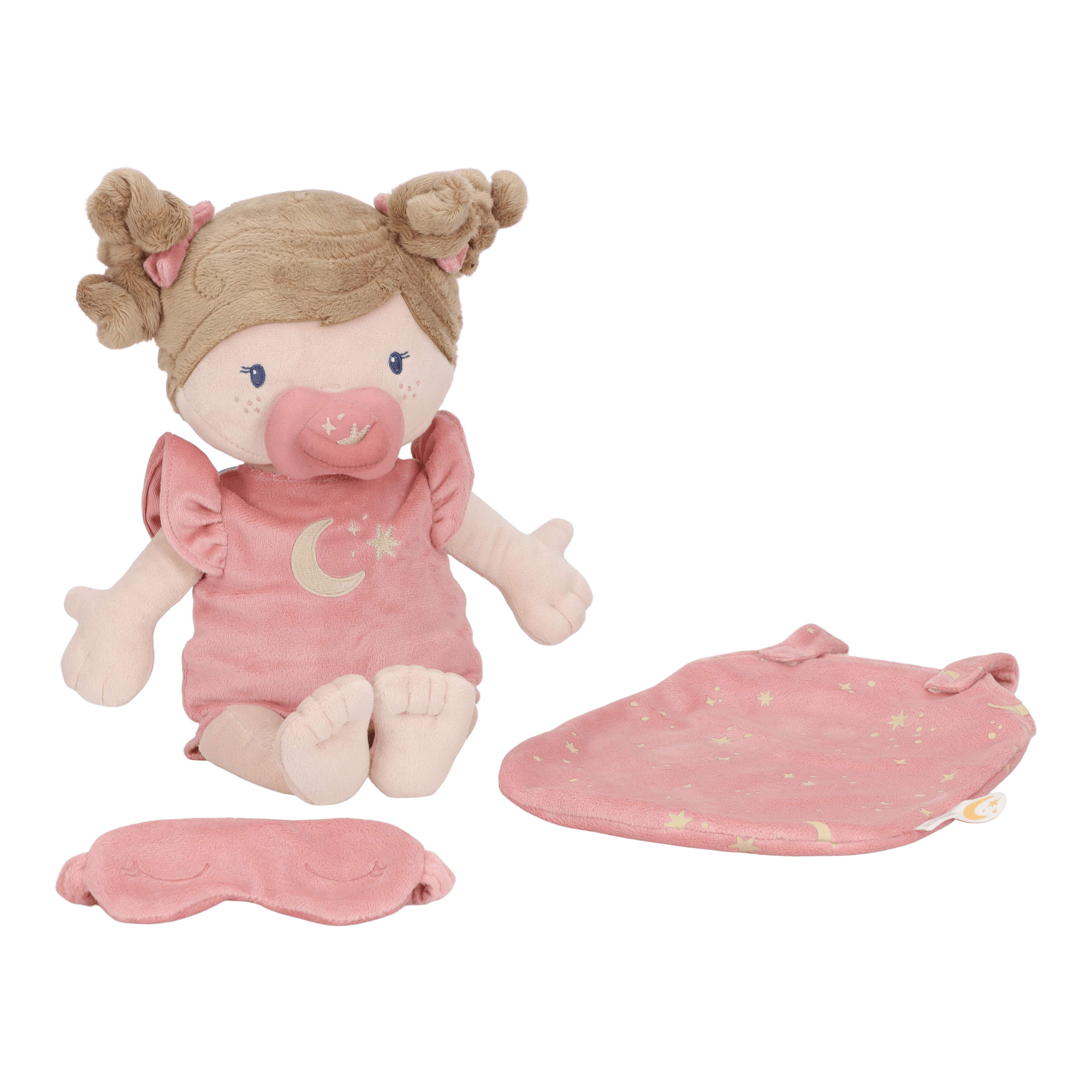 Meet Rosa, the soft sleeping friend for your little one. With her sweet face, cuddly soft body, and cute sleeping bag with a moon and stars pattern, she brings comfort and security.