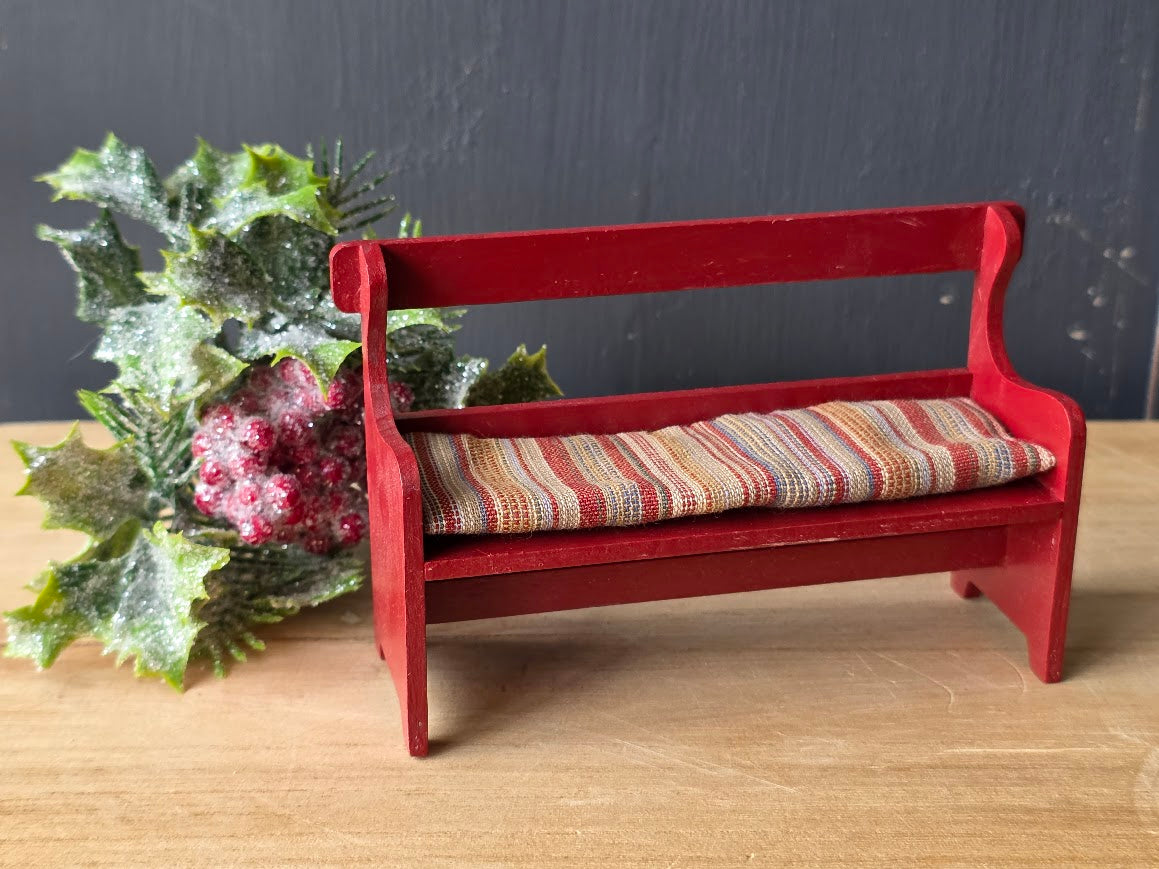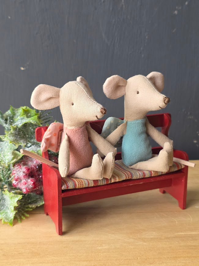 Cute wooden Maileg Mouse Bench with a fabric seat cushion. The ideal place for your little mouse to sit and rest after a long day playing.