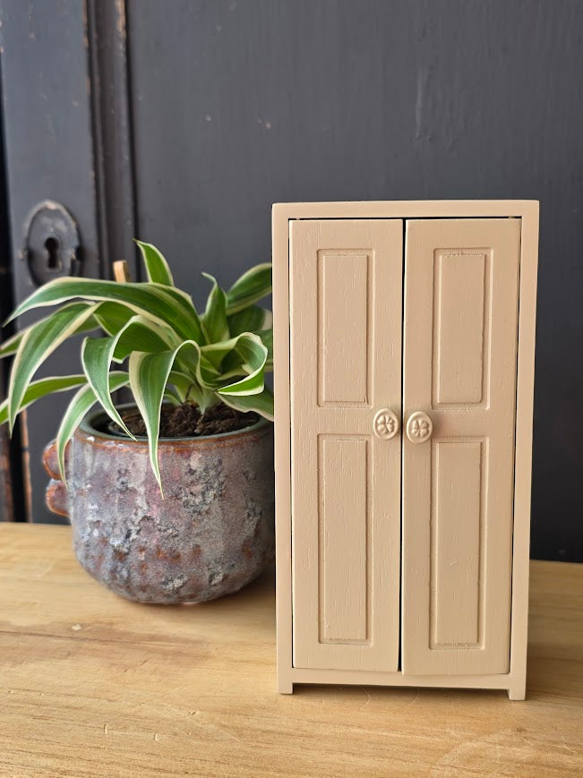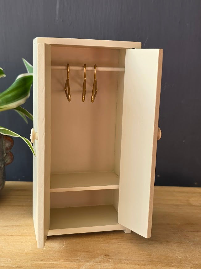 A small closet helps the mouse family organize their wardrobe. The closet comes with three golden hangers.