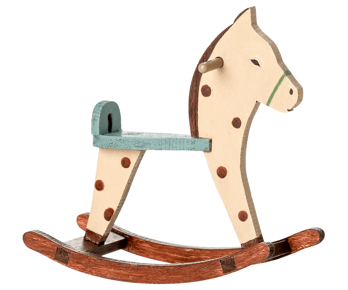 This season Bluebell has matched Maileg's micro bunny who has magnets in her hands with a rocking horse and carry cot. As she has magnets in her hands she can hold onto the rocking horse.