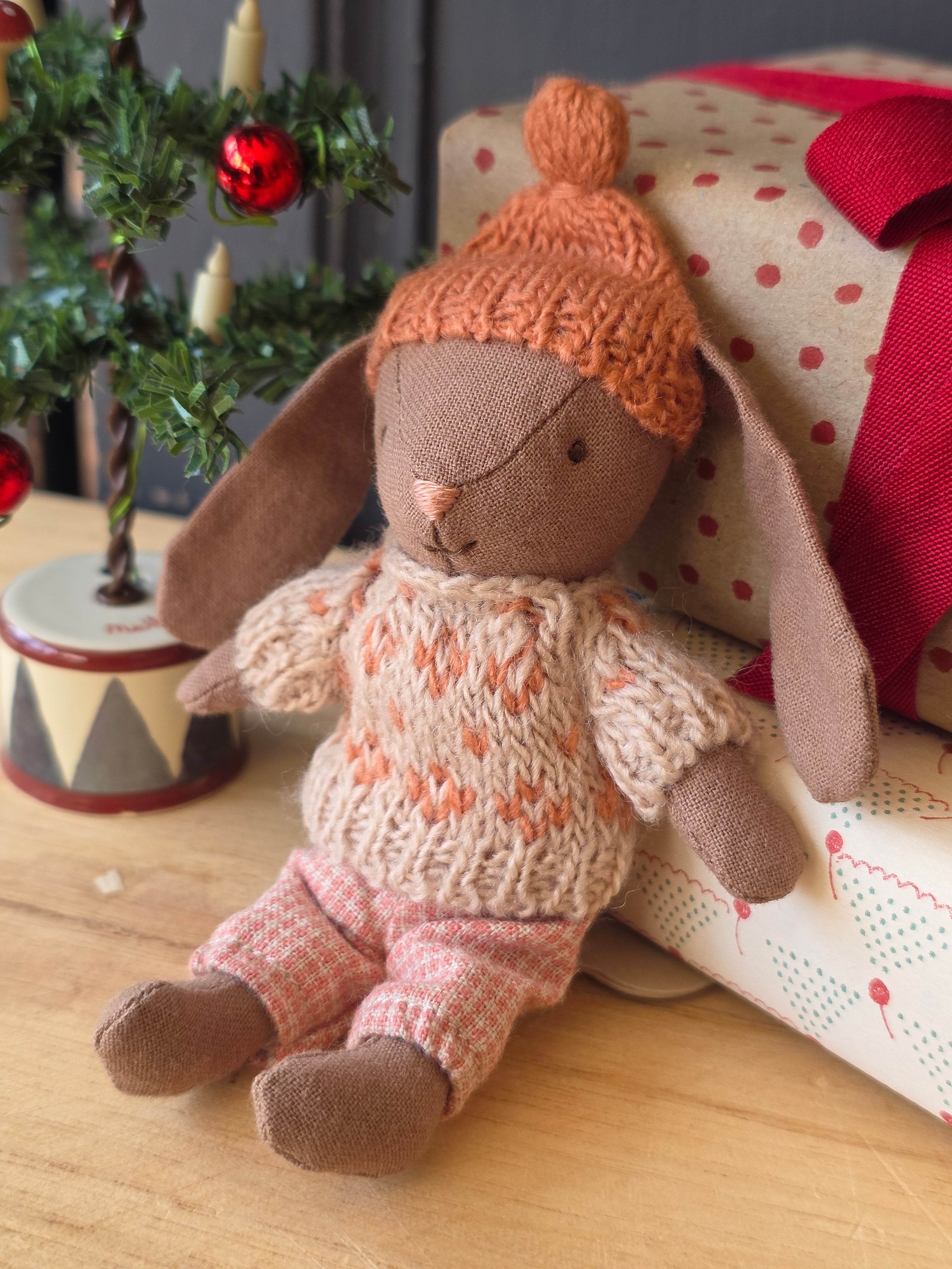 This cute little bunny comes dressed in a pom pom styled knitted hat, knitted jumper and checked trousers