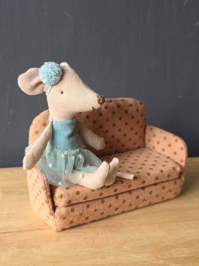 Looking for a handy solution for your growing mouse family? This sofa can be used as a couch by day, and then pulled out into a bed for night time. It is made in soft fabrics to ensure a comfortable night sleep for your Maileg friends.