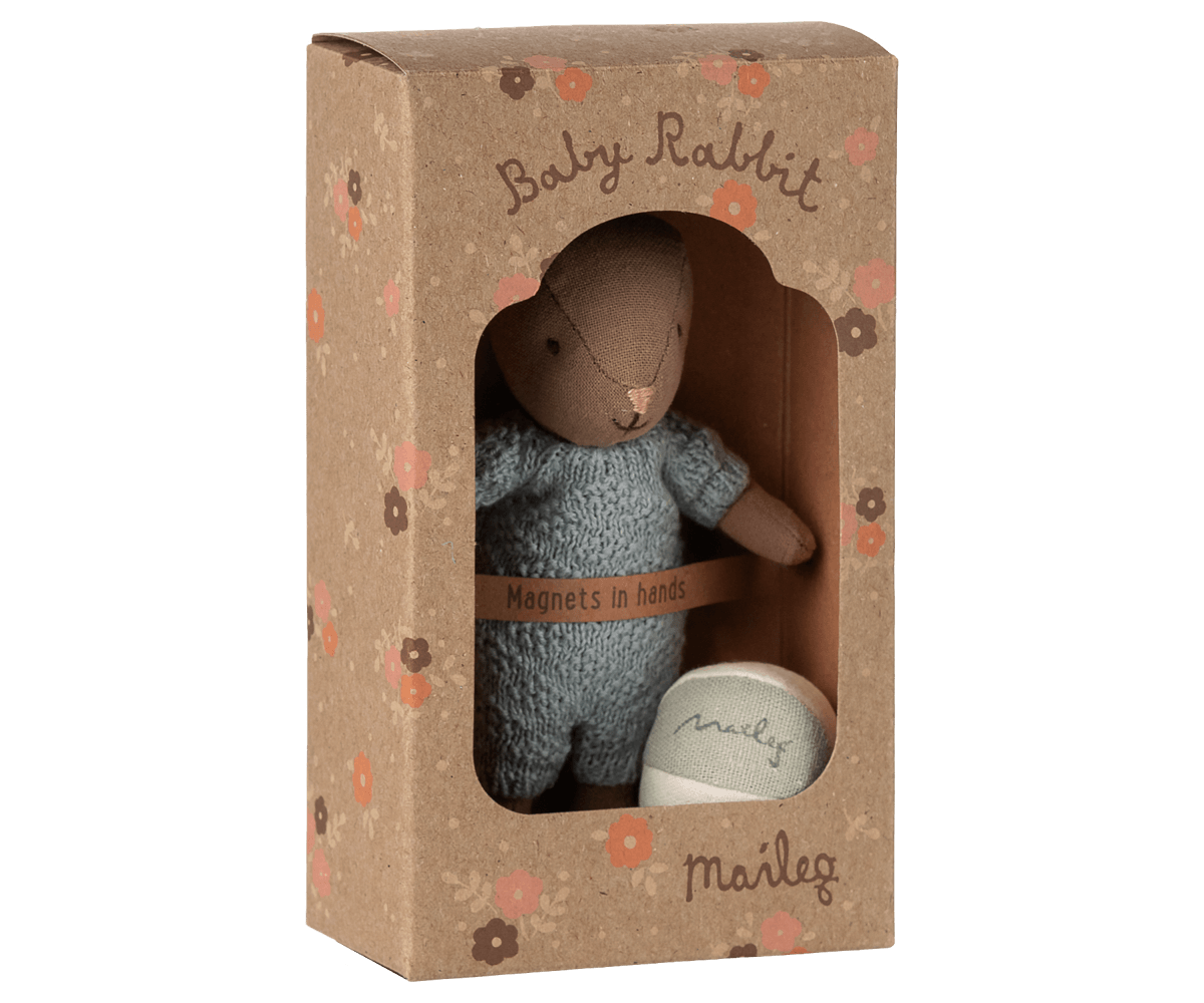Maileg Micro sized rabbit dressed in a cute knitted jumpsuit. He comes with a baby ball to play with.