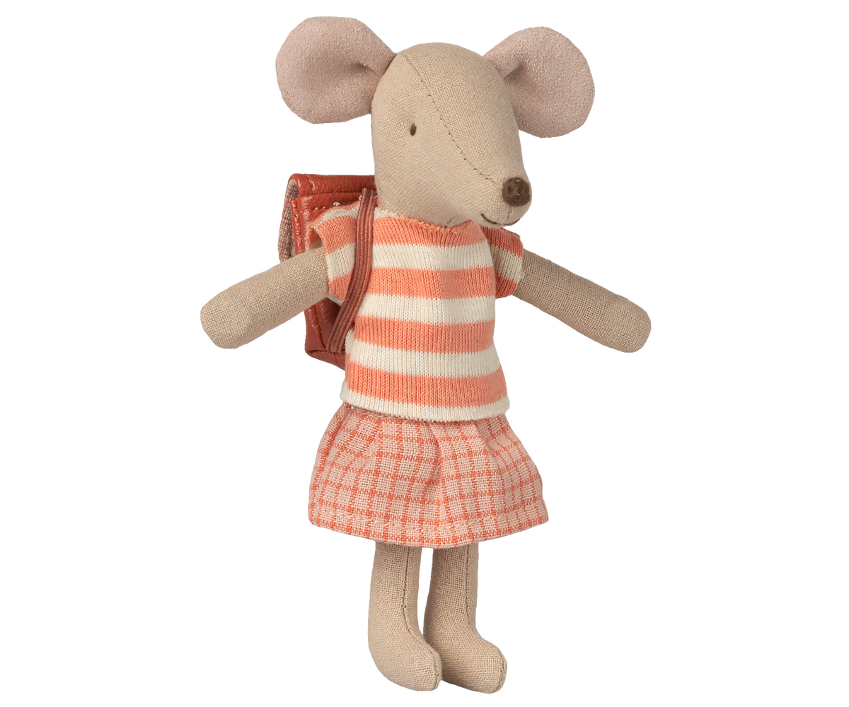 Big sister mouse is ready for a day in school, carrying her backpack on the back. She has magnets in her hands so she can hold the handles of the tricycle for a fast trip.