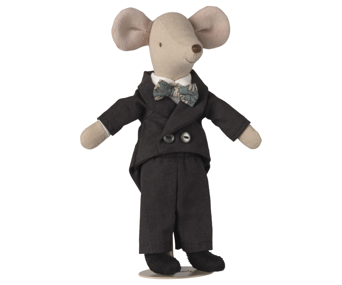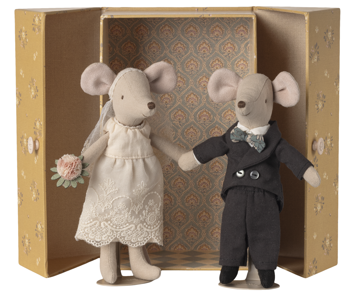 A beautiful love story that starts on the wedding day of these two mice. They are dressed classically in a long white dress, lace veil, bouquet and tuxedo. They come in a beautiful box decorated with Maileg print.