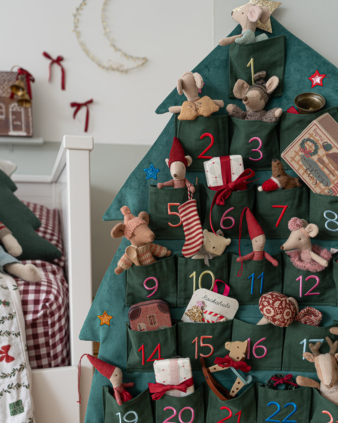 Our gorgeous re-useable advent calendar has 24 roomy pockets ready to fill with sweets, treats and plenty of Rockahula clips or ponies! Made from super soft velvet and shaped like a Christmas tree, this calendar is adorned with a gold star topper and brightly coloured glitter stars! Each pocket is embroidered with colourful numbers - making it super fun on the countdown to Christmas!