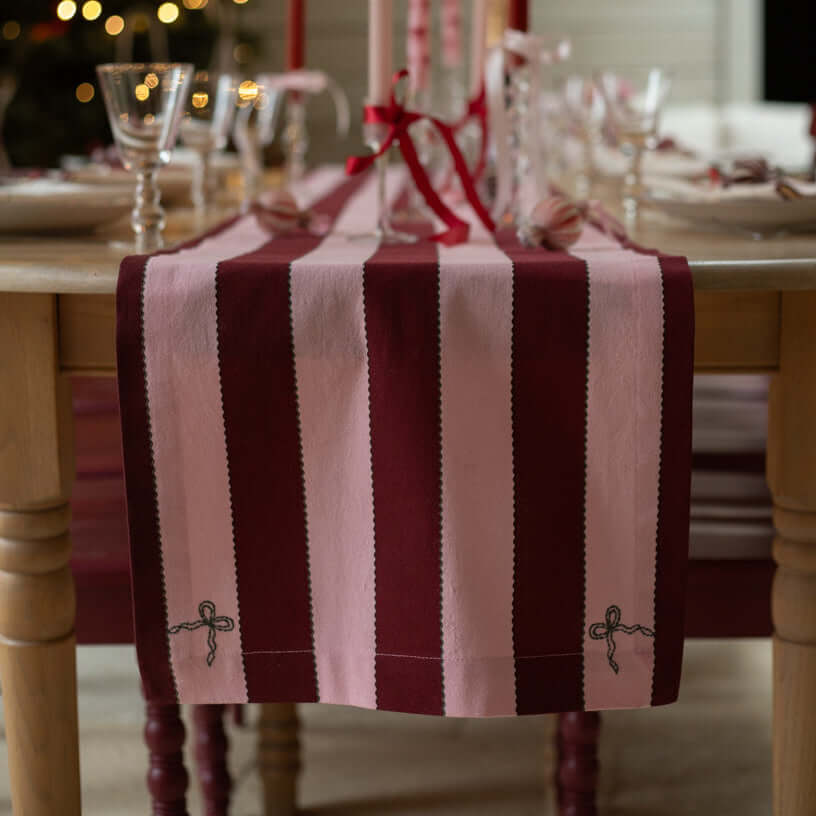 Complete your Christmas dinner tablespace with this 100% Organic Cotton Table Runner. Featuring a playful pink and red stripe, dark green binding and delicate embroidered bows.